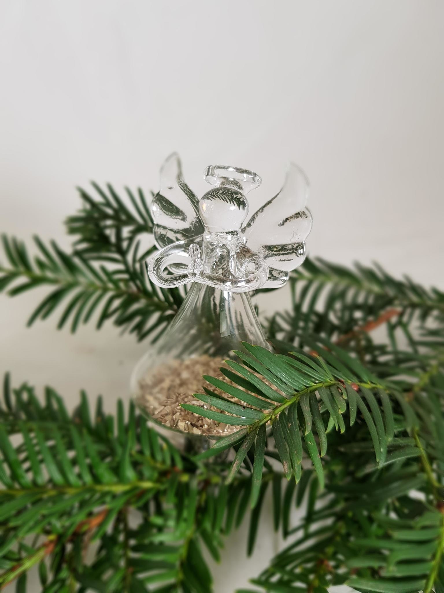 • 2 anges en verre transparent, remplis de paillettes dorées, à clipser sur le sapin.