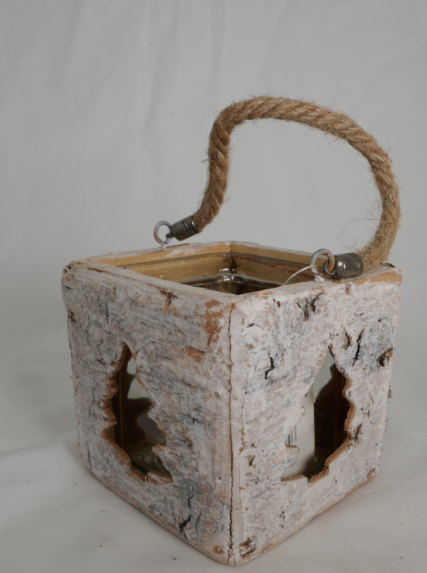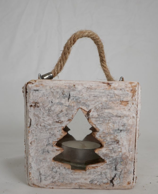 Photophore carré écorce de bouleau, décor sapins. Anse en corde naturelle.