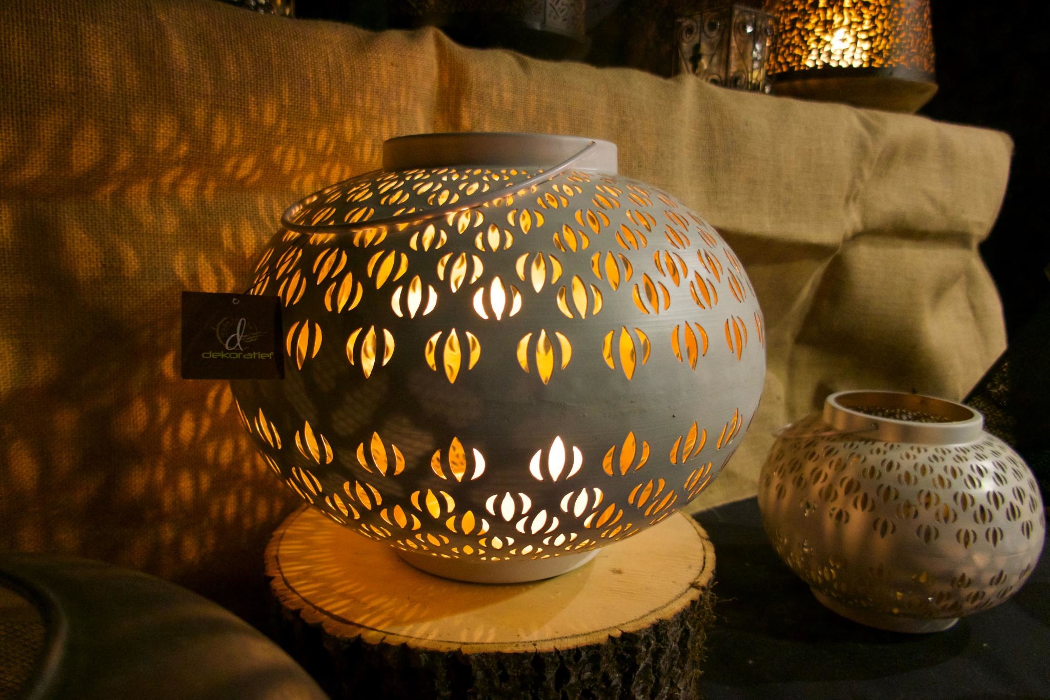 Lanterne en métal Extérieur blanc, intérieur doré20cm de diamètre, 18cm de hauteur