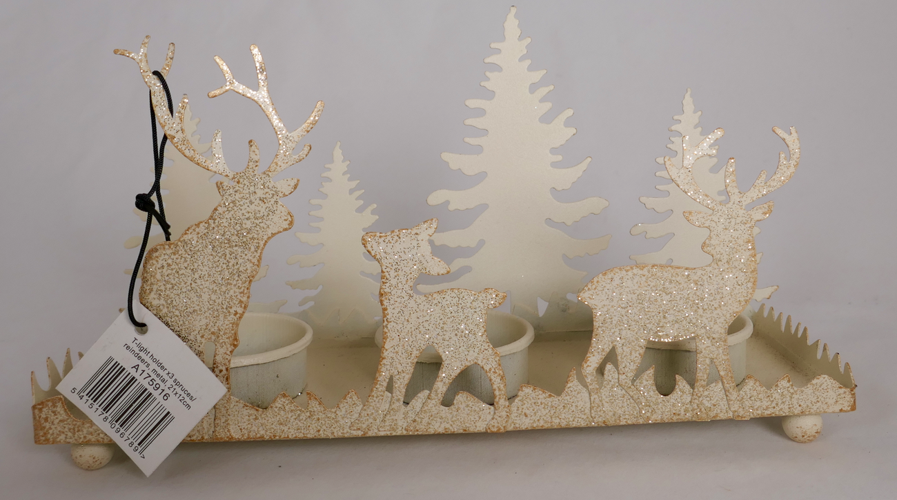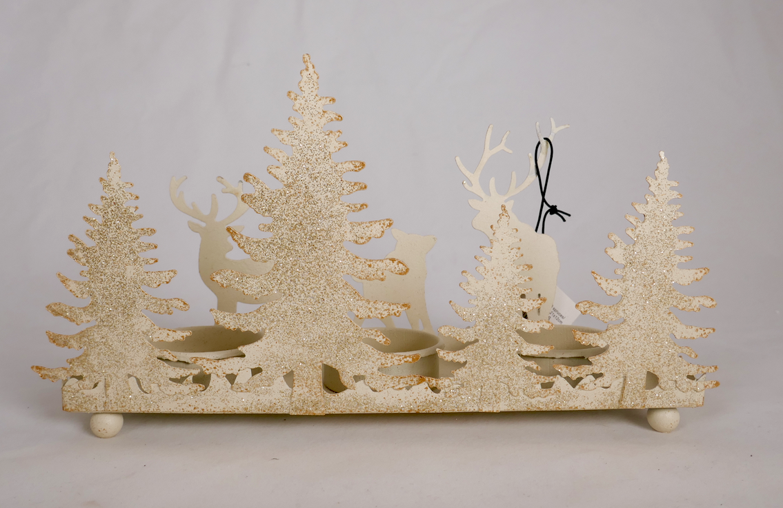 Porte-bougies métal blanc décor sapins et rennes, 3 bougies
